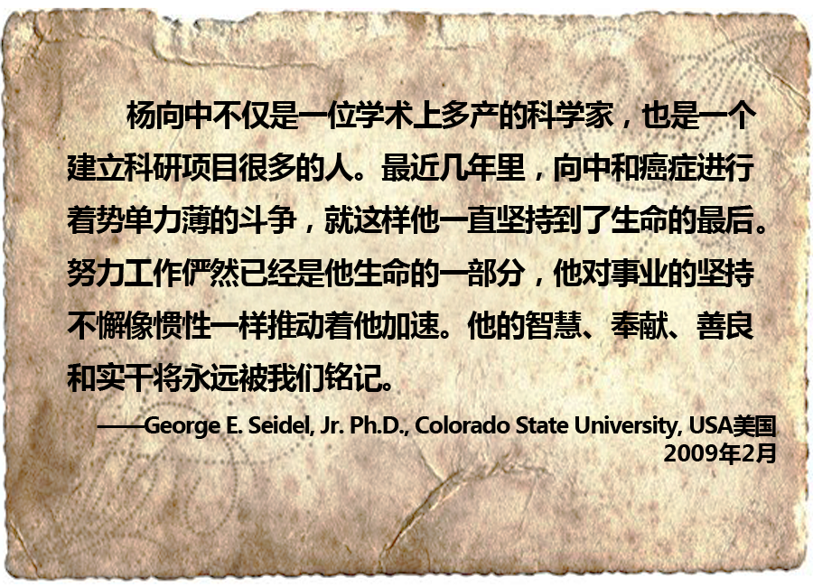 楊向中博士的一生雖然短暫,但是沾溉后人的事跡很多,成就也很多,寫不勝寫。今天,我們僅以這篇小小的微信文章紀念向中公司的創立者逝世9周年,緬懷之余,也希望不僅有美國人還有更多的中國人記住他的名字——著名華裔科學家世界“克隆牛之父”楊向中!