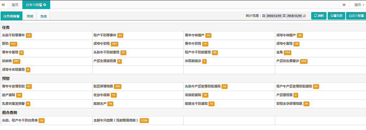 在牧場管理軟件上,管理者可以看到監(jiān)督牛場各項生產(chǎn)任務(wù)的通知和對部分管理環(huán)節(jié)的預(yù)警,例如斷奶通知、干奶通知、產(chǎn)后配種通知等。這些功能是對到期應(yīng)開展的具體到牛號的工作任務(wù)提醒,以督促相關(guān)人員及時準(zhǔn)確地執(zhí)行,避免延誤造成損失。