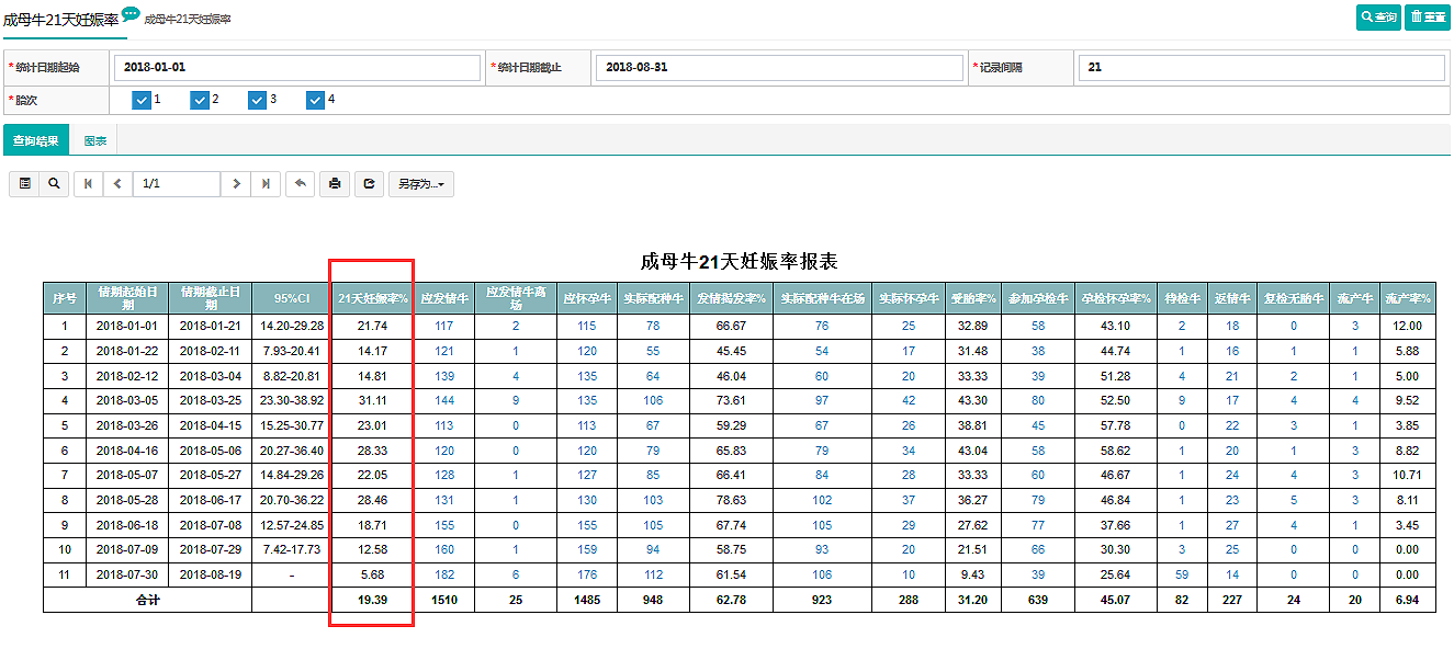 通過指標(biāo)數(shù)據(jù)對關(guān)鍵管理環(huán)節(jié)加以評估和監(jiān)控,并與企業(yè)標(biāo)準(zhǔn)和行業(yè)標(biāo)準(zhǔn)進(jìn)行對比,根據(jù)數(shù)據(jù)的差異可以幫助管理者及時發(fā)現(xiàn)問題,防微杜漸,以保證牧場的生產(chǎn)經(jīng)營持續(xù)、穩(wěn)定、健康地發(fā)展,如21天妊娠率的指標(biāo)監(jiān)控。下圖是奶業(yè)之星?牧場管理信息系統(tǒng)對牧場21天妊娠率的監(jiān)控數(shù)據(jù)。