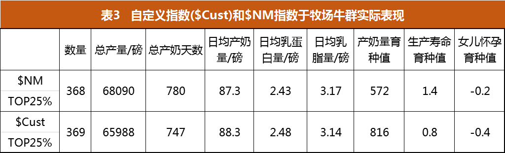為了可以進一步了解自定義指數和$NM指數在實際牧場中表現在2017年美國一家牧場對約1500只母牛進行了回顧性分析。使用父母平均值用以計算每頭奶牛的自定義指數($Cust)和$NM指數。表3顯示了兩個指標前25%的母牛各個性狀的實際表現和遺傳育種值。很有意思的是,自定義指數的群體平均產奶時間減少了33天。
