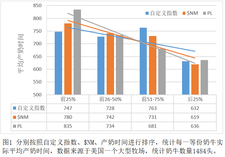當對群體中所有牛群按照四等分進行比較時,兩種選擇指數與奶牛的平均產奶時間產生了較大的差異,使用$NM指數與平均產奶時間的線性趨勢更加一致,這表明$NM指數對奶牛的產奶壽命指向性更好。(圖1)